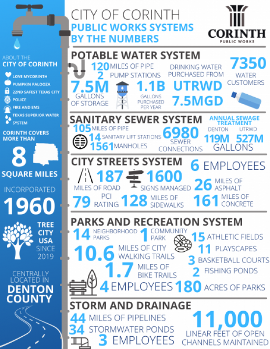 Public Works is the combination of physical assets, management practices, policies, and personnel necessary for government to provide and sustain structures and services essential to the welfare and acceptable quality of life for the citizens of Corinth.