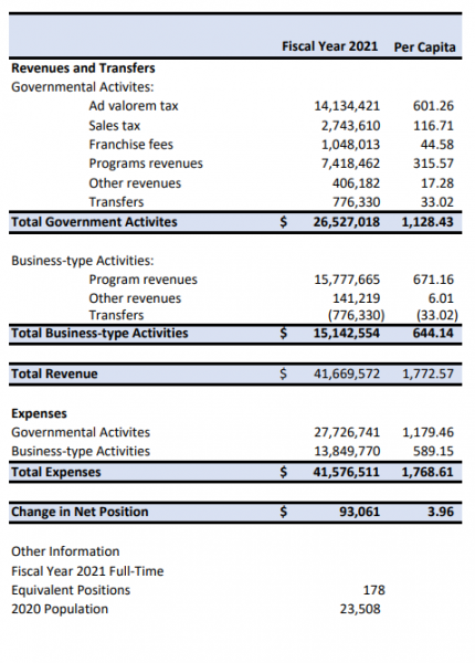 Governmental funds represent programs and services that benefit citizens and visitors, such as public safety, the library, parks and recreation, animal services and capital maintenance. The costs of these services are primarily financed with property tax and sales tax revenues. Proprietary funds rely on fees and charges for their support. These funds include the provision of water, wastewater, storm drainage, and trash collection services.